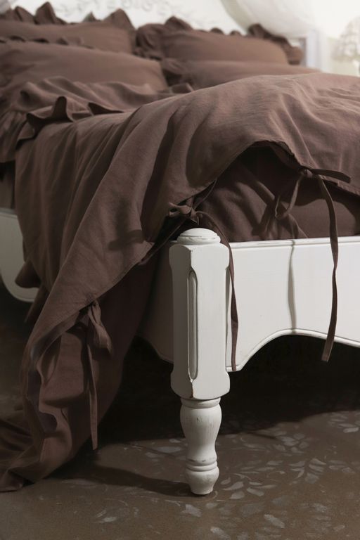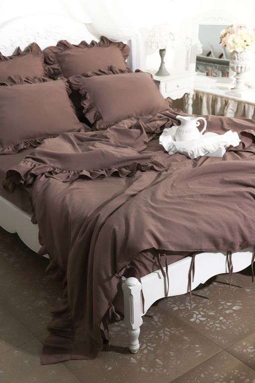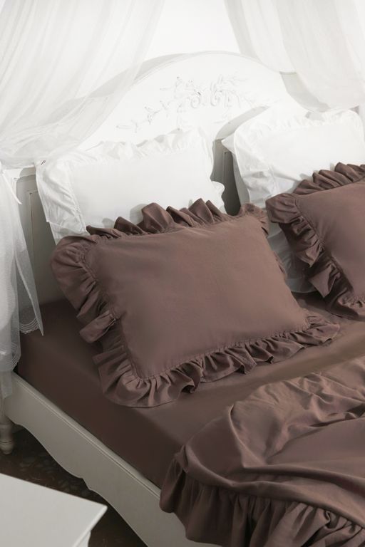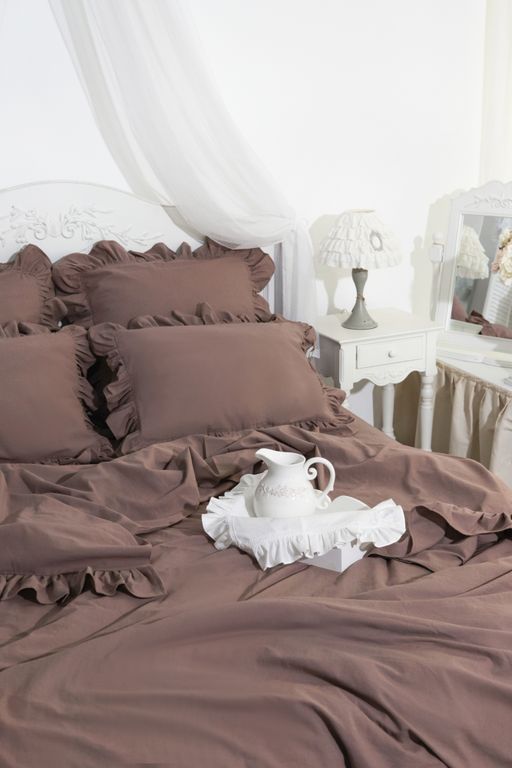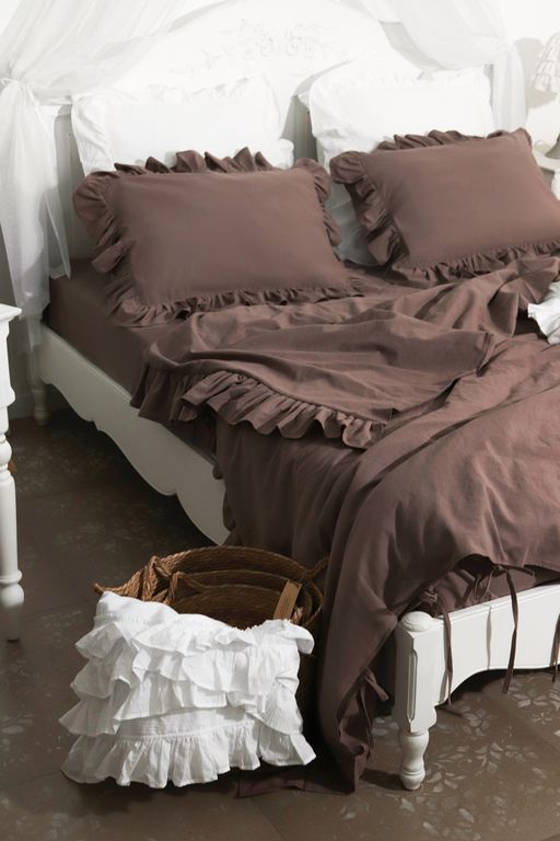 Постельный комплект с оборками в глубоком шоколадном оттенке — про тепло, спокойствие и ощущение укутывающего уюта. Это цвет вечернего света, тишины и дома, где хочется замедлиться. Натуральный хлопок с добавлением льна приятно ощущается на коже, красиво драпируется и создаёт живую, чуть расслабленную фактуру. Оборки добавляют мягкости и того самого «характера», который делает спальню по-настоящему жилой.