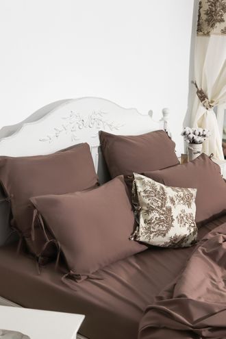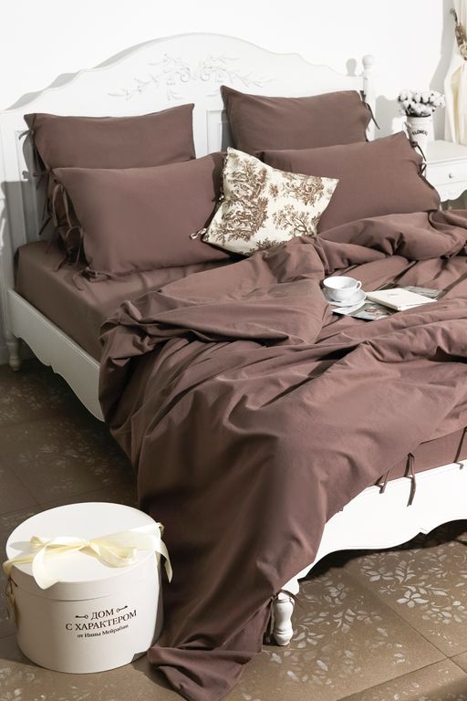Постельный комплект на завязках в глубоком шоколадном оттенке — про тепло, тишину и ощущение укутывающего уюта. Это цвет вечернего света и дома, где хочется замедлиться и выдохнуть. Натуральная ткань из хлопка с добавлением льна приятно ощущается на коже, красиво драпируется и создаёт живую, слегка расслабленную фактуру. Завязки добавляют аккуратный декоративный акцент и тот самый «характер», который делает спальню по-настоящему жилой.