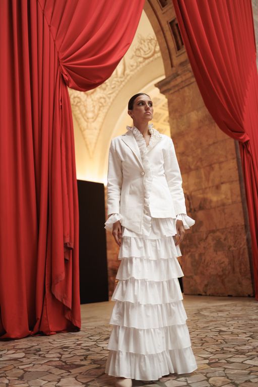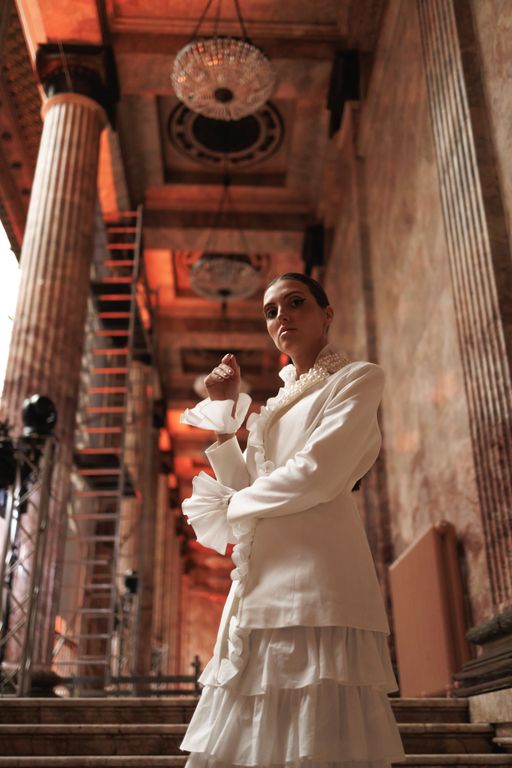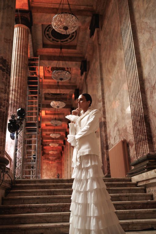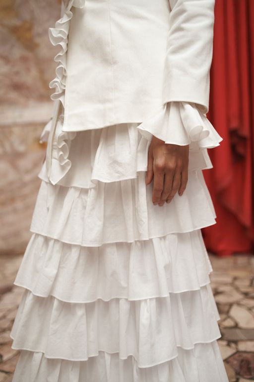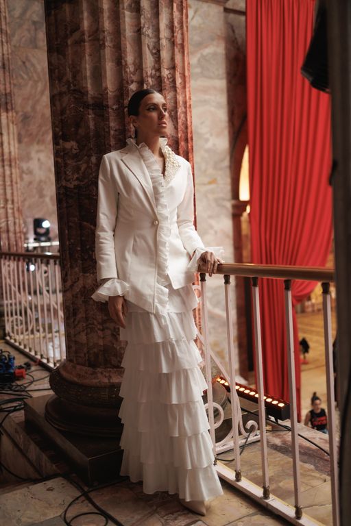 Рюши создают вертикальный ритм и визуально вытягивают фигуру, а многослойная юбка уравновешивает строгость верха мягкостью движения.