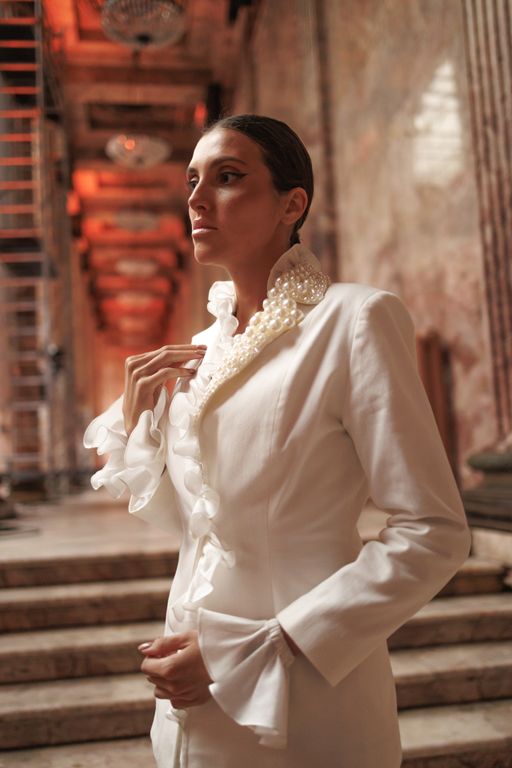 Образ «Жакет с жемчугом» — это сочетание чёткой архитектуры и тонкой декоративной работы. Приталенный силуэт формирует собранный, уверенный образ, а жемчужная отделка вдоль линии горловины и борта добавляет глубины и благородства.