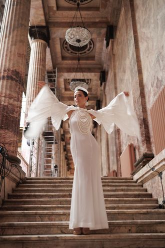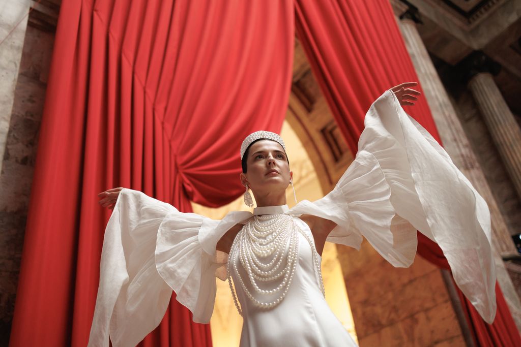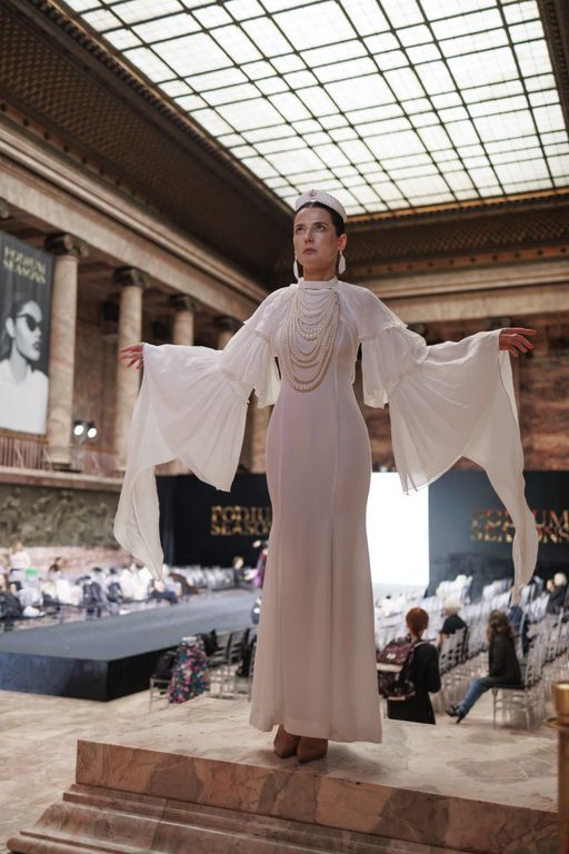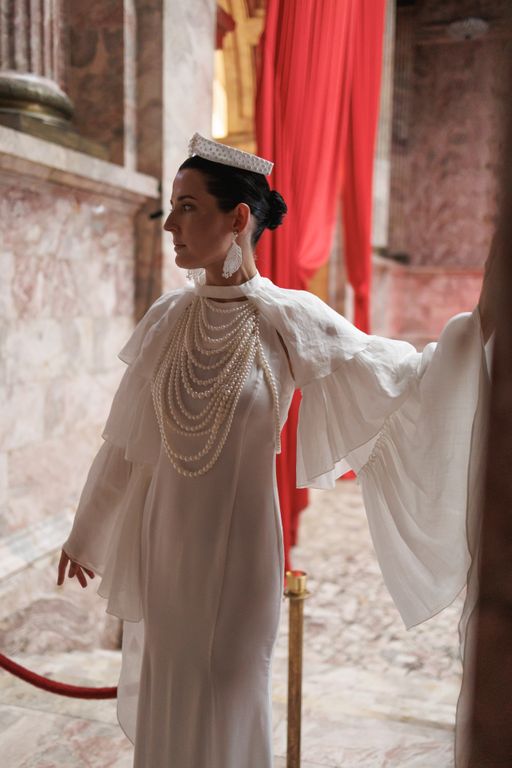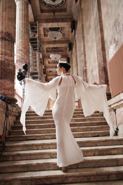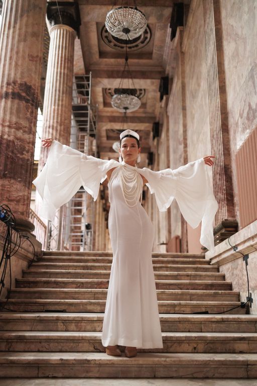 Платье в пол с летящими рукавами-крыльями. Образ «Принцесса-лебедь» — про лёгкость, чистоту линий и тихую силу.