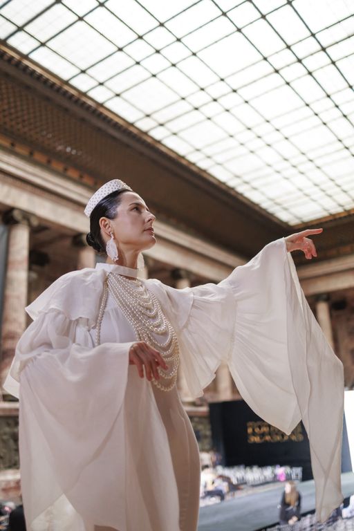 Образ «Принцесса-лебедь» — это воплощение воздушной женственности и плавного движения. Платье в пол формирует вытянутый, благородный силуэт, а струящиеся рукава-крылья становятся продолжением рук, создавая эффект полёта и невесомости.