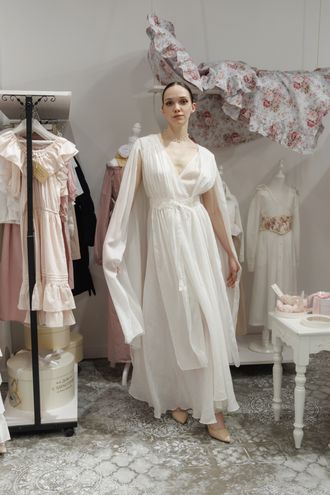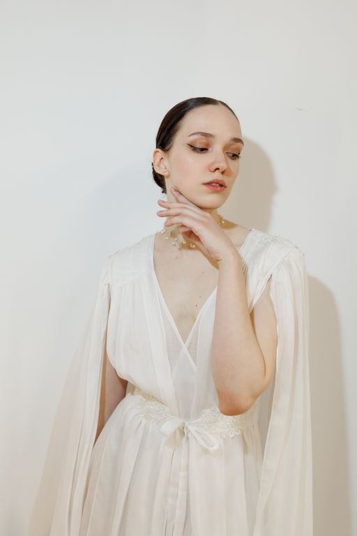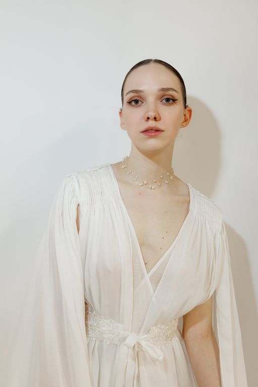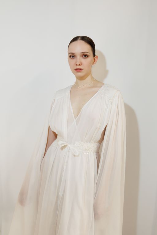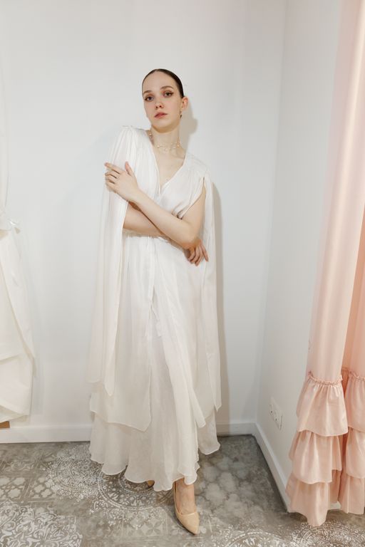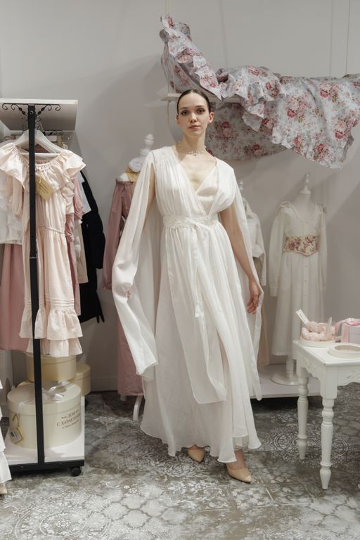 Будуарное платье из крапивы и шелка — это образ тонкой, естественной чувственности без излишней декоративности. Лёгкая многослойность, мягкий силуэт и полупрозрачные фактуры создают ощущение воздуха и движения.