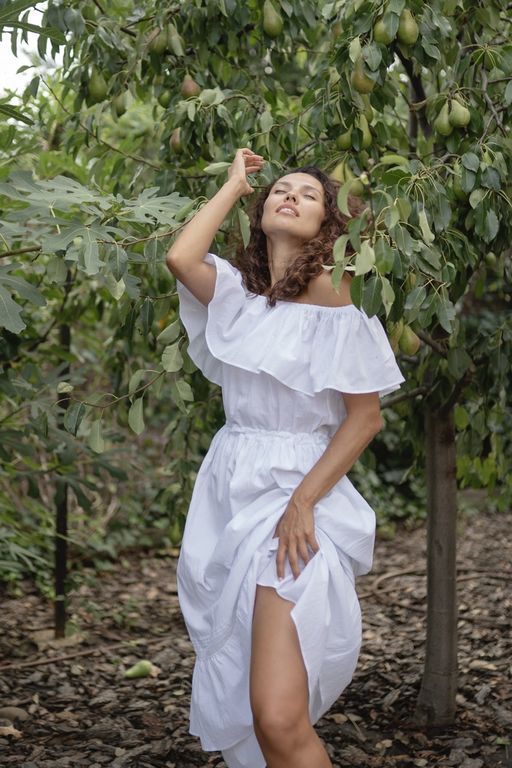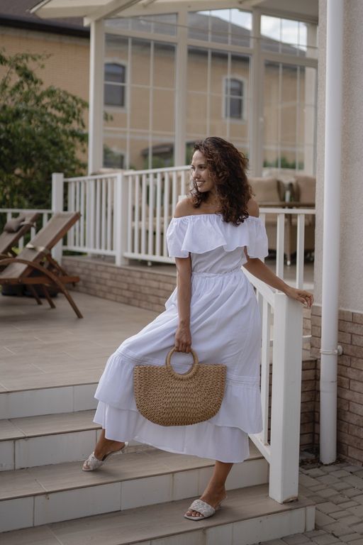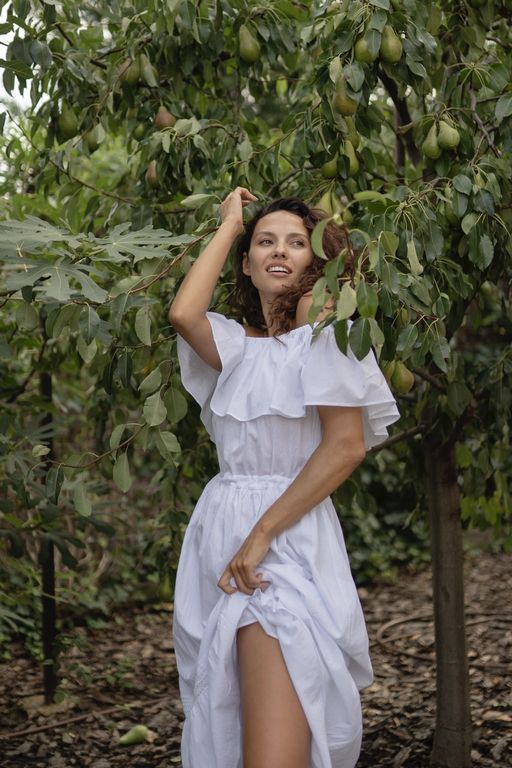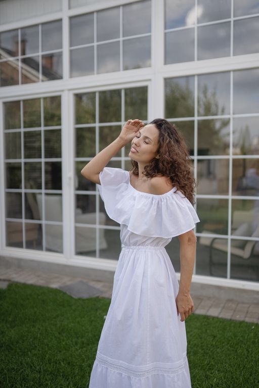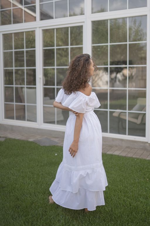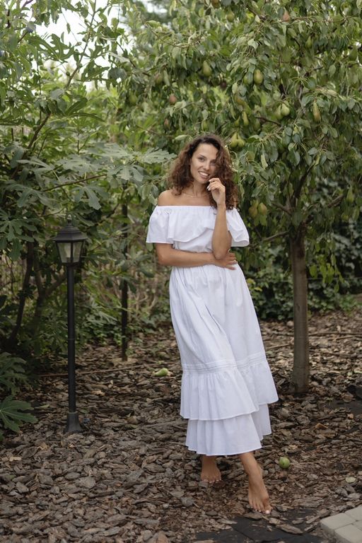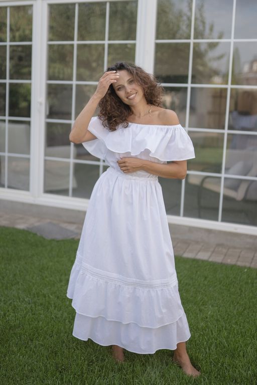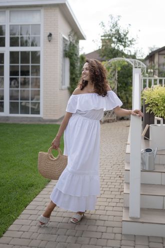 Летнее платье с романтическими воланами на плечах и юбке создано, чтобы дарить вам комфорт и красоту.