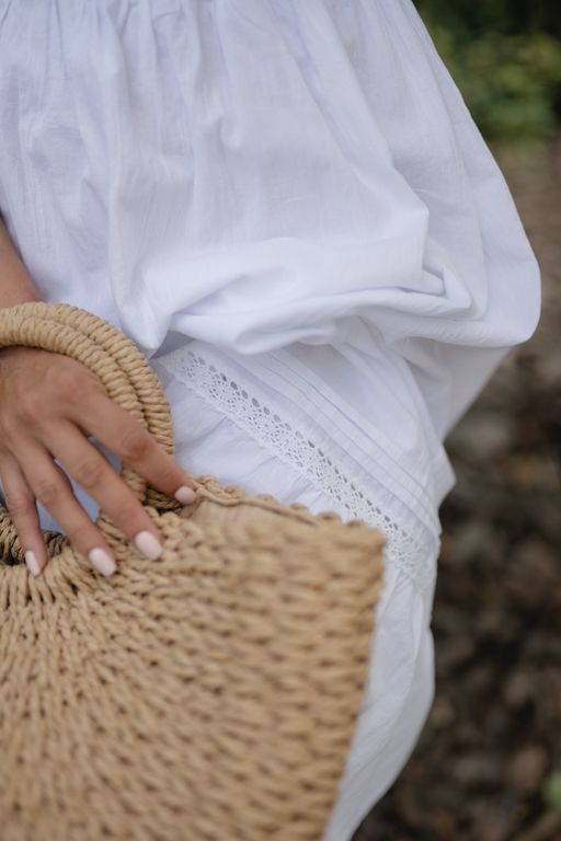 Юбка платья украшена утонченными защипами, хлопковым кружевом и пышными оборками, которые придают образу легкости и романтичности.