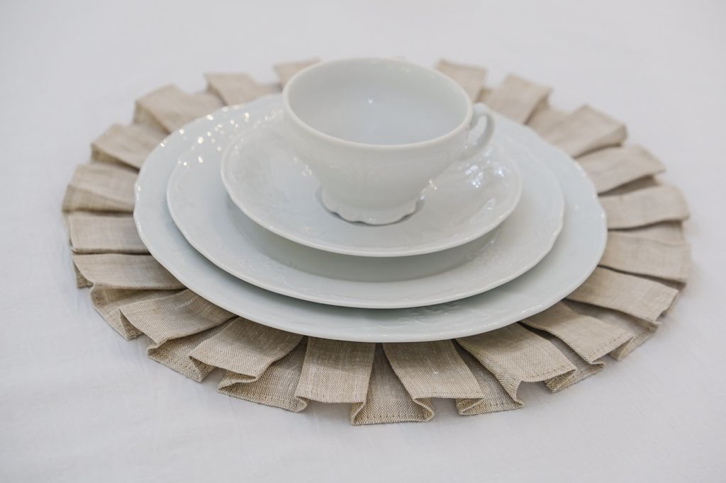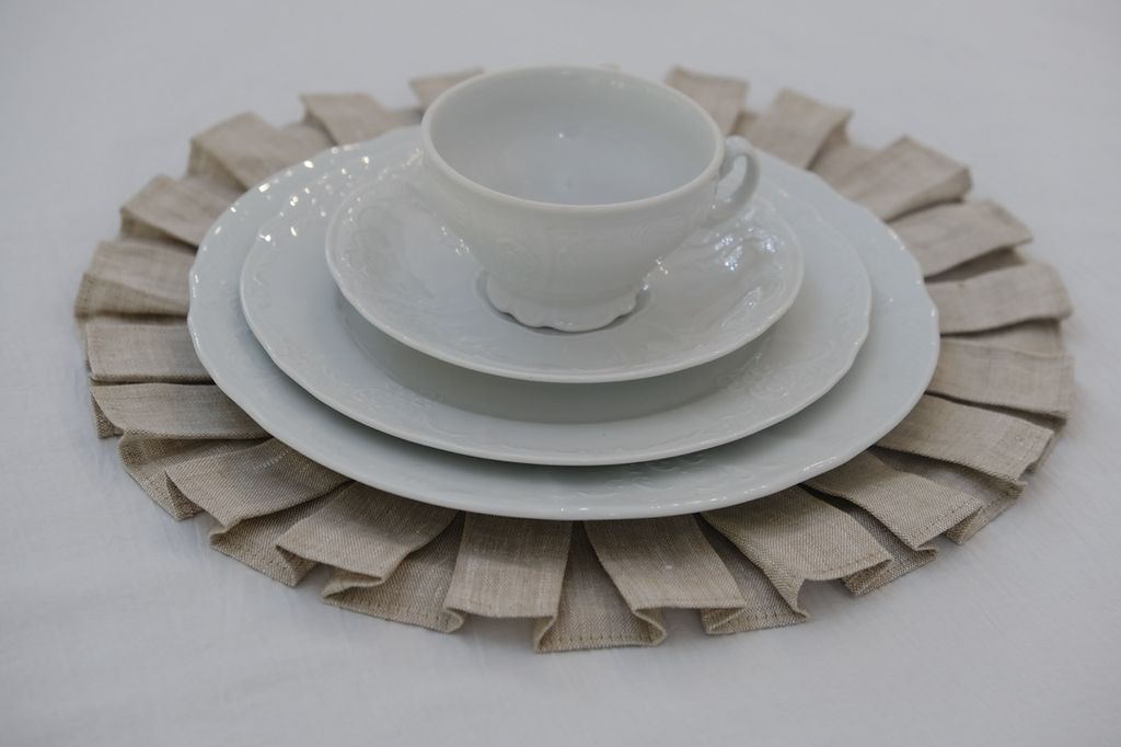 Лён не окрашен и остаётся в своём натуральном цвете, что позволяет ему гармонично сочетаться с различными стилями оформления. Диаметр салфетки 45 см идеально подходит для использования как декоративный элемент при сервировке тарелок для каждого гостя.