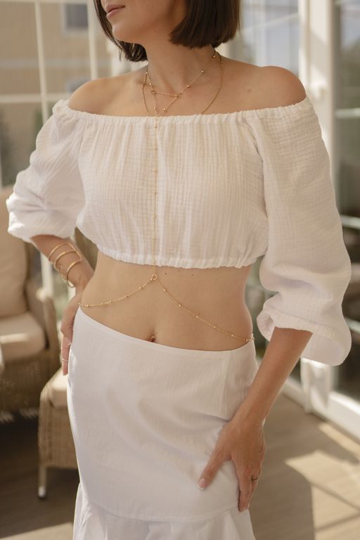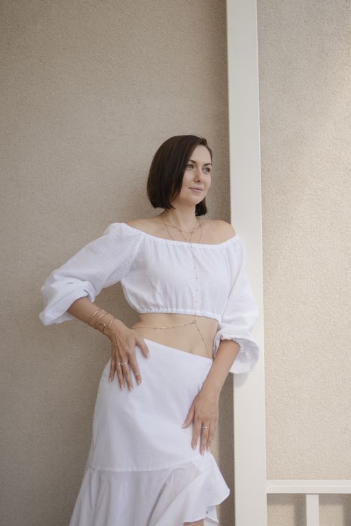 Особенности ее кроя заключаются в том, что кокетка скорректирована таким образом, чтобы создать максимальную имитацию силуэта, приближенного к песочным часам. Пошита она из батиста — 100% тончайших лопок, что обеспечивает невероятный комфорт и стиль.