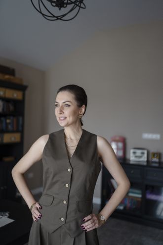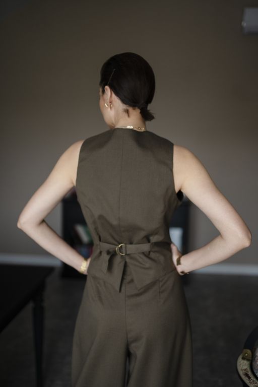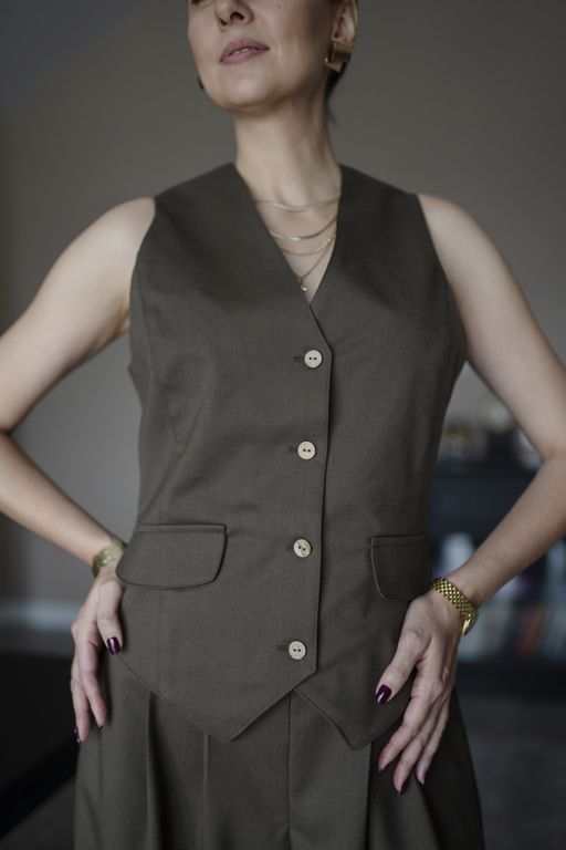 Приталенный силуэт подчеркивает талию, а регулируемая застежка сзади позволяет настроить жилет под ваши параметры.